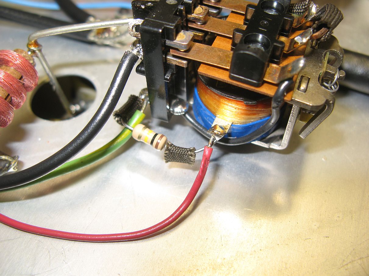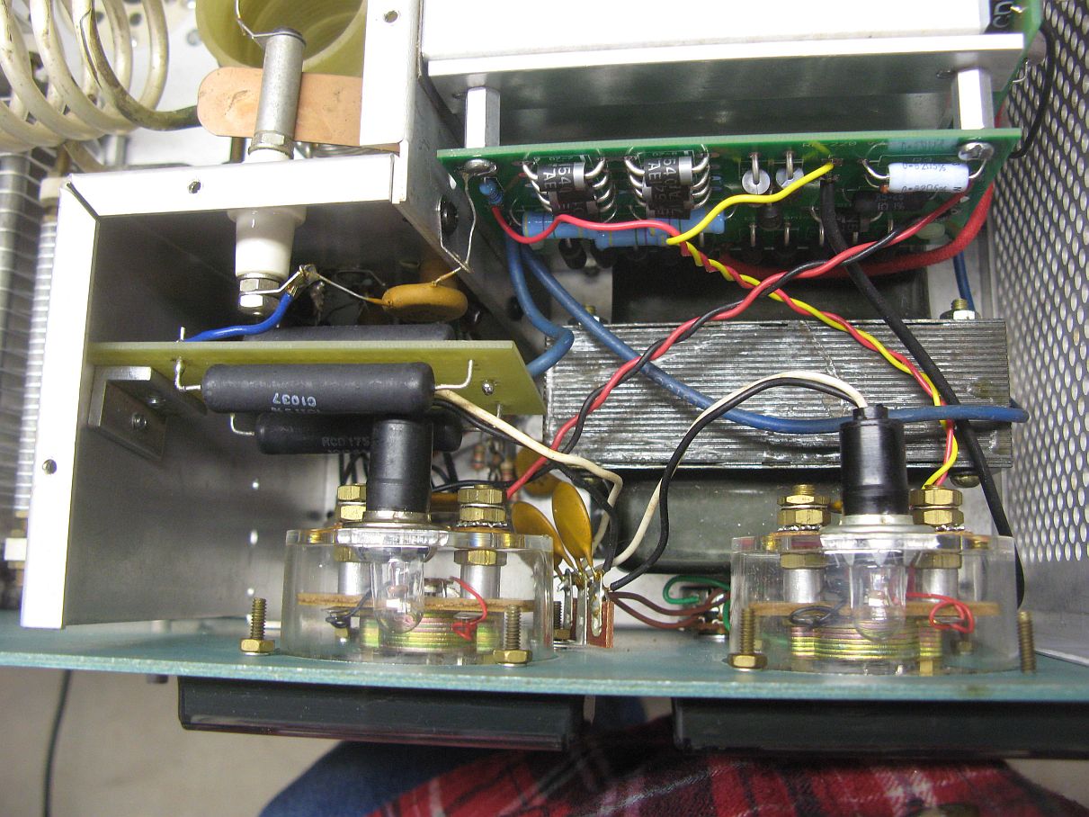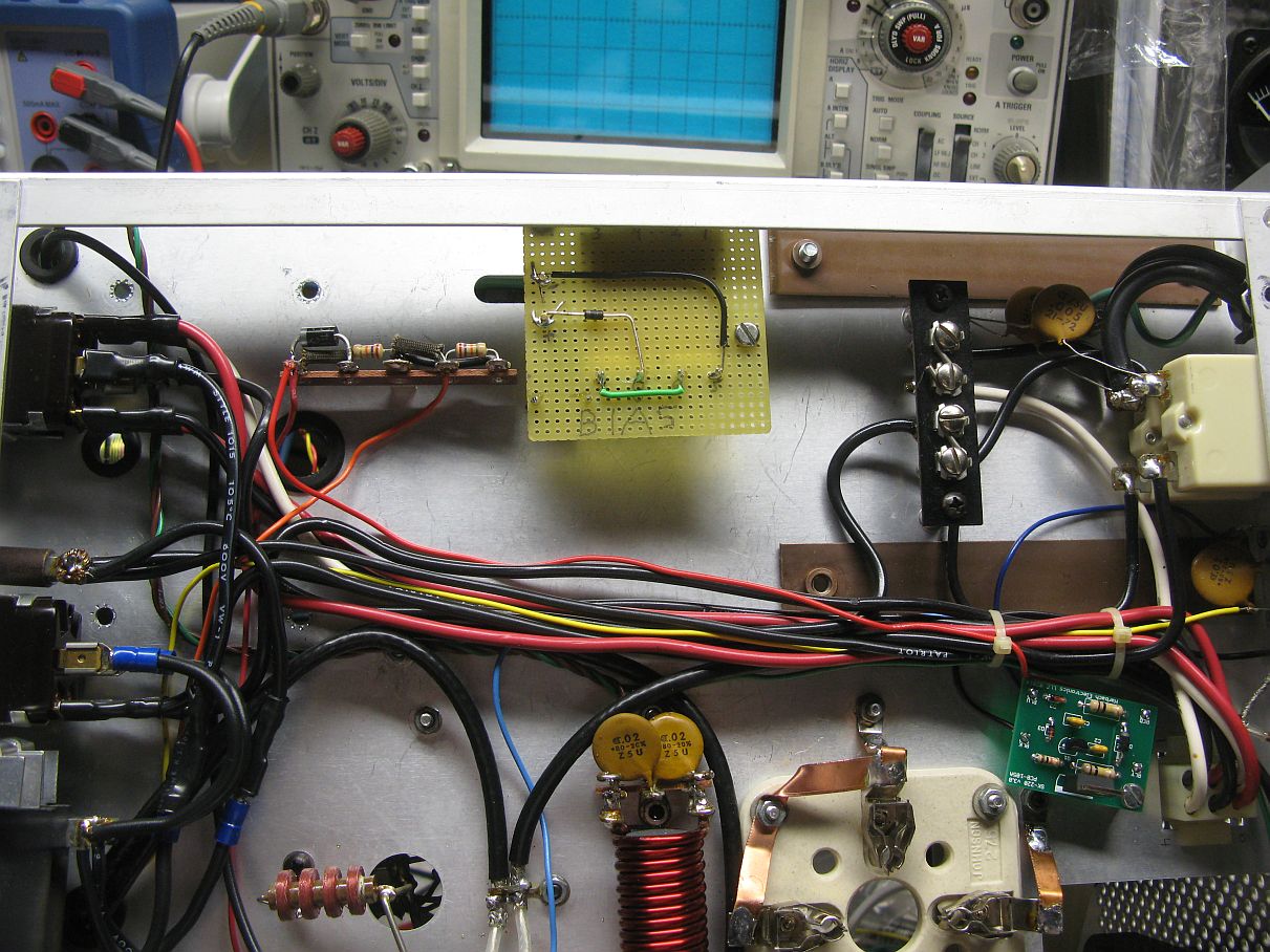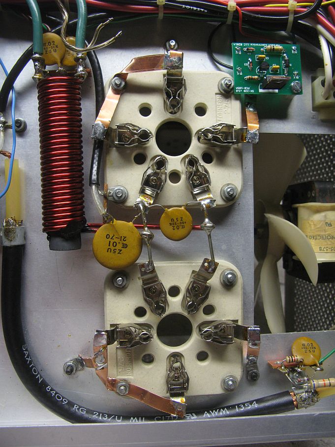 at Electronic Specialities in Resistive Bias Mod: I also did the "WY6K - An Essential Mod to the SB-220 and SB-221". There are two versions of this modification,. I did the second that positively biases the tubes off with 120 volts through a 100K resistor. This circuit biases the tubes into cutoff in RX mode by pulling the cathode up toward the 120 volt bias supply voltage through the 100k resistor. There will be some voltage drop across the resistor, but the cathode will still be close to 100 volts and firmly in cutoff. If the cathode shorts to ground through the grid, the current is limited to about 1 ma and the transformer will not melt down. Voile. This mod is completed at the TR relay. Here is the before picture and here is the after. When the T/R relay is switched into TX mode, an 8 diode string on the new Harbach diode board (replacing the original 5V zener) is connected to the center tap of the filament transformer, taking the cathode to + 6.8 volts and biasing the amp as intended for class AB2 operation. This is called "resistive bias", whereas the original circuit used "voltage bias". In addition, I removed